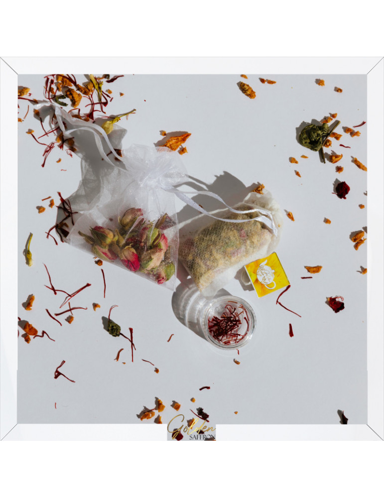 - Each teabag includes chamomile, Rose Petal, and Pure Saffron